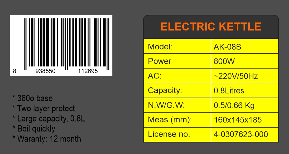 | Ấm siêu tốc Inox hiệu Aulux Công suất: 800W/ dung tích 0.8L Chất liệu Inox 201 Đế xoay 306 độ Bảo vệ quá nhiệt, Tự động ngắt. Nhựa ABS tiêu chuẩn quốc tế Bảo hành 01 năm. |