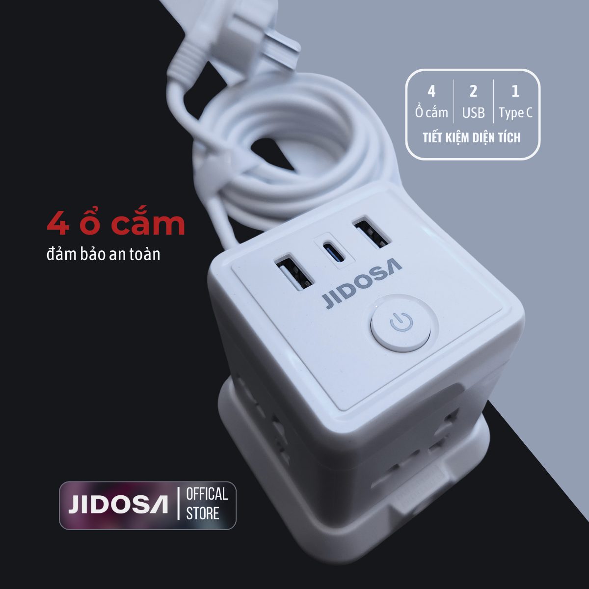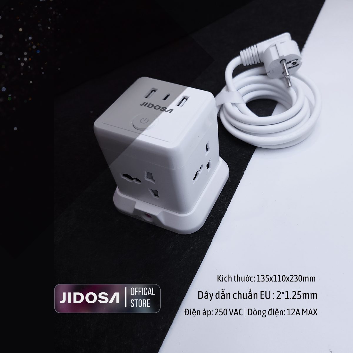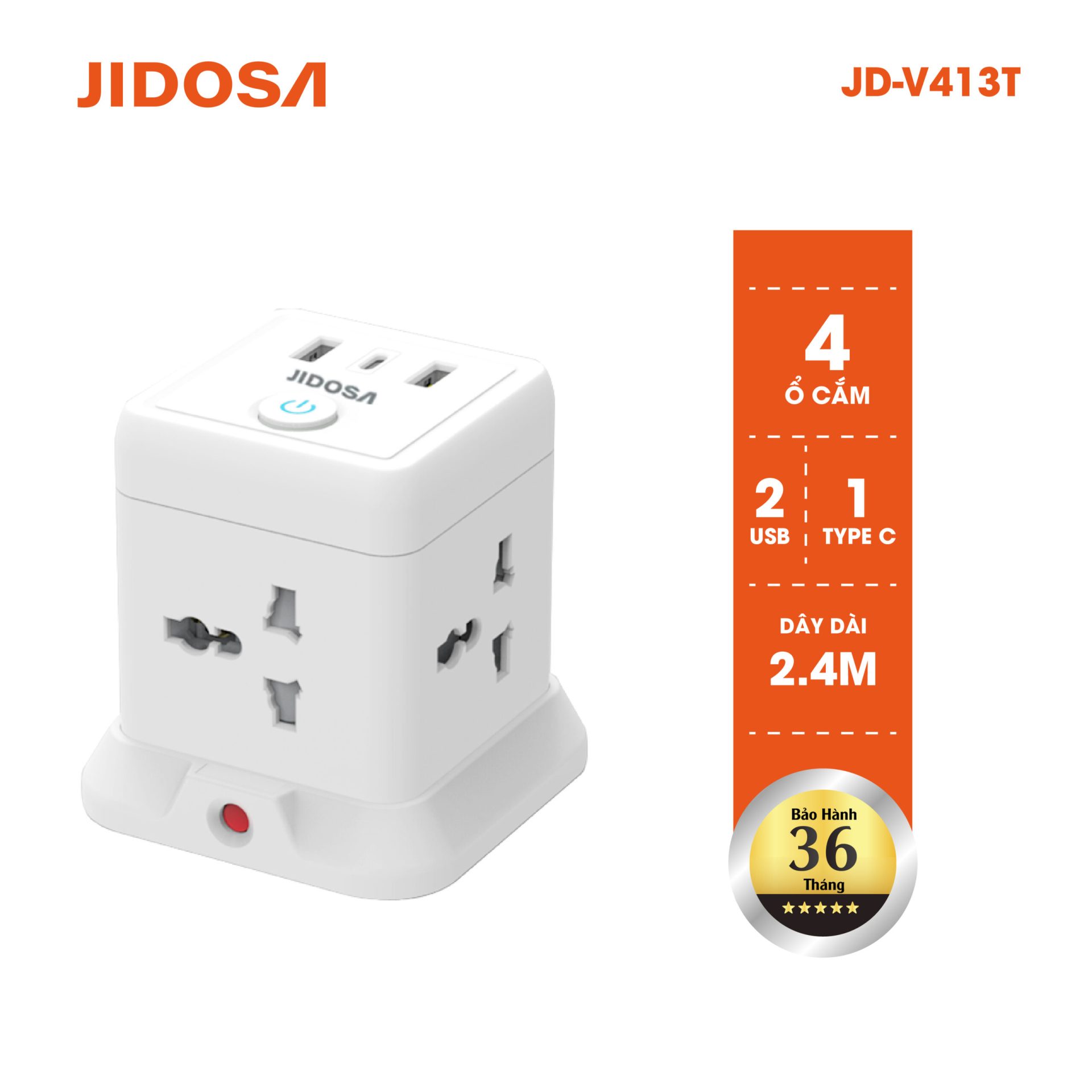 Ổ Cắm Điện Đa Năng nhiều lỗ cắm hình tháp JIDOSA JD-V413T Chịu Tải 3000W USB+ Type C 4 ổ dây 2.4m